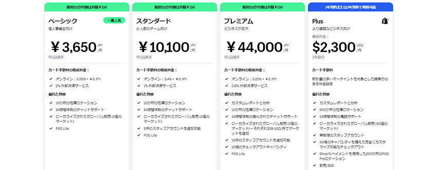 Shopifyでは、料金やサービス内容の異なる5つのプランを用意しています。